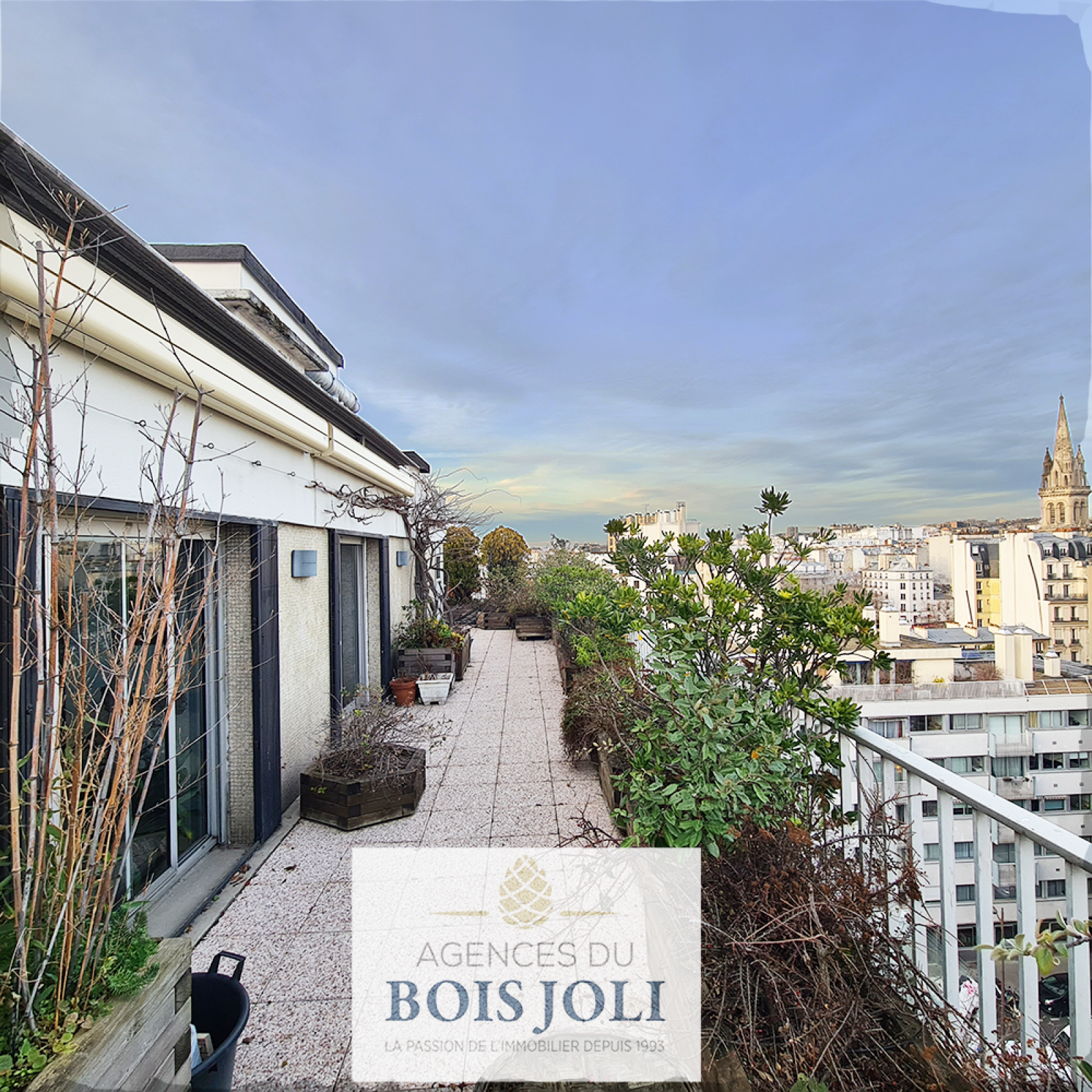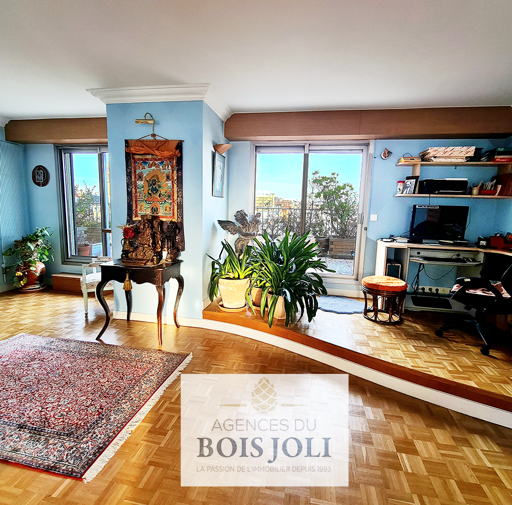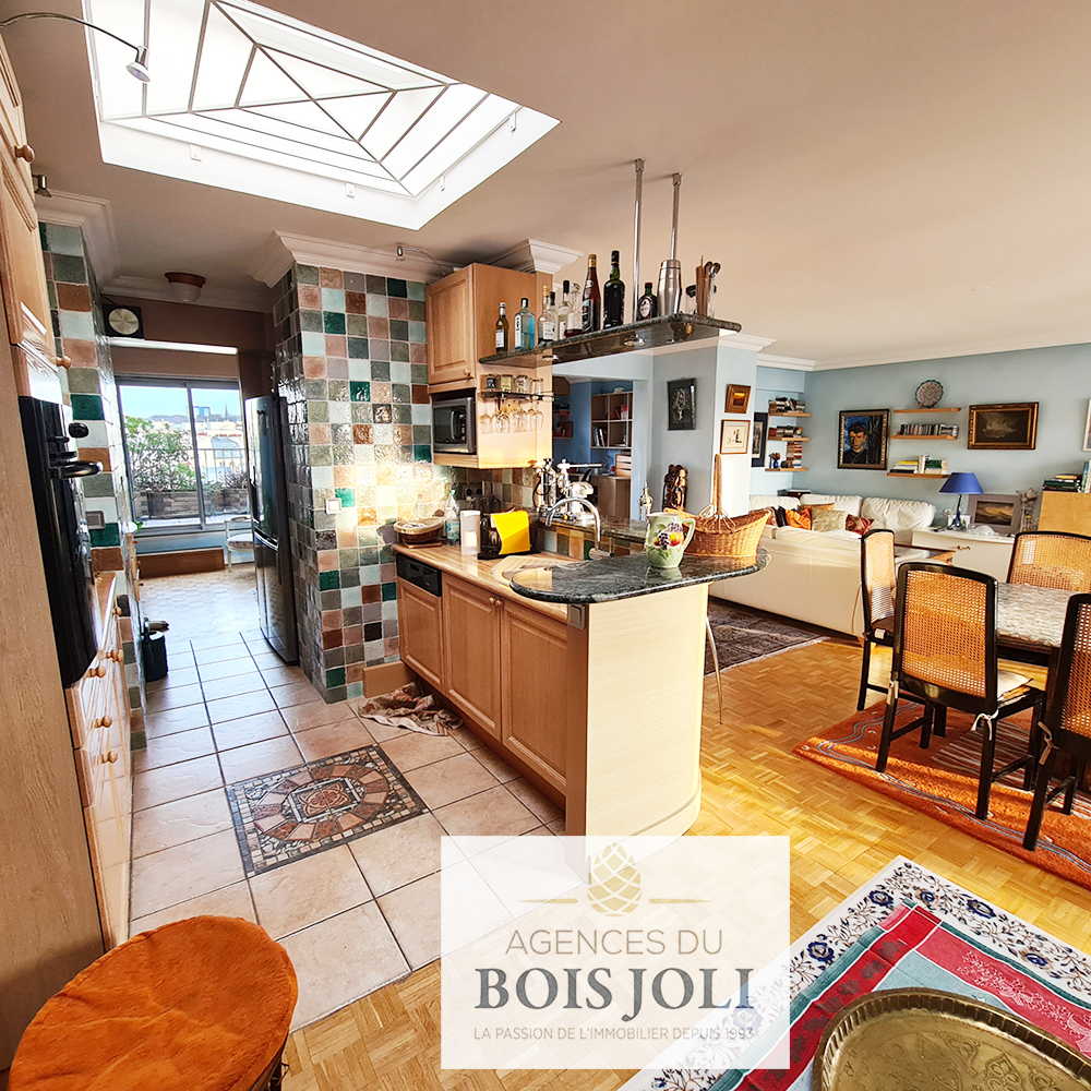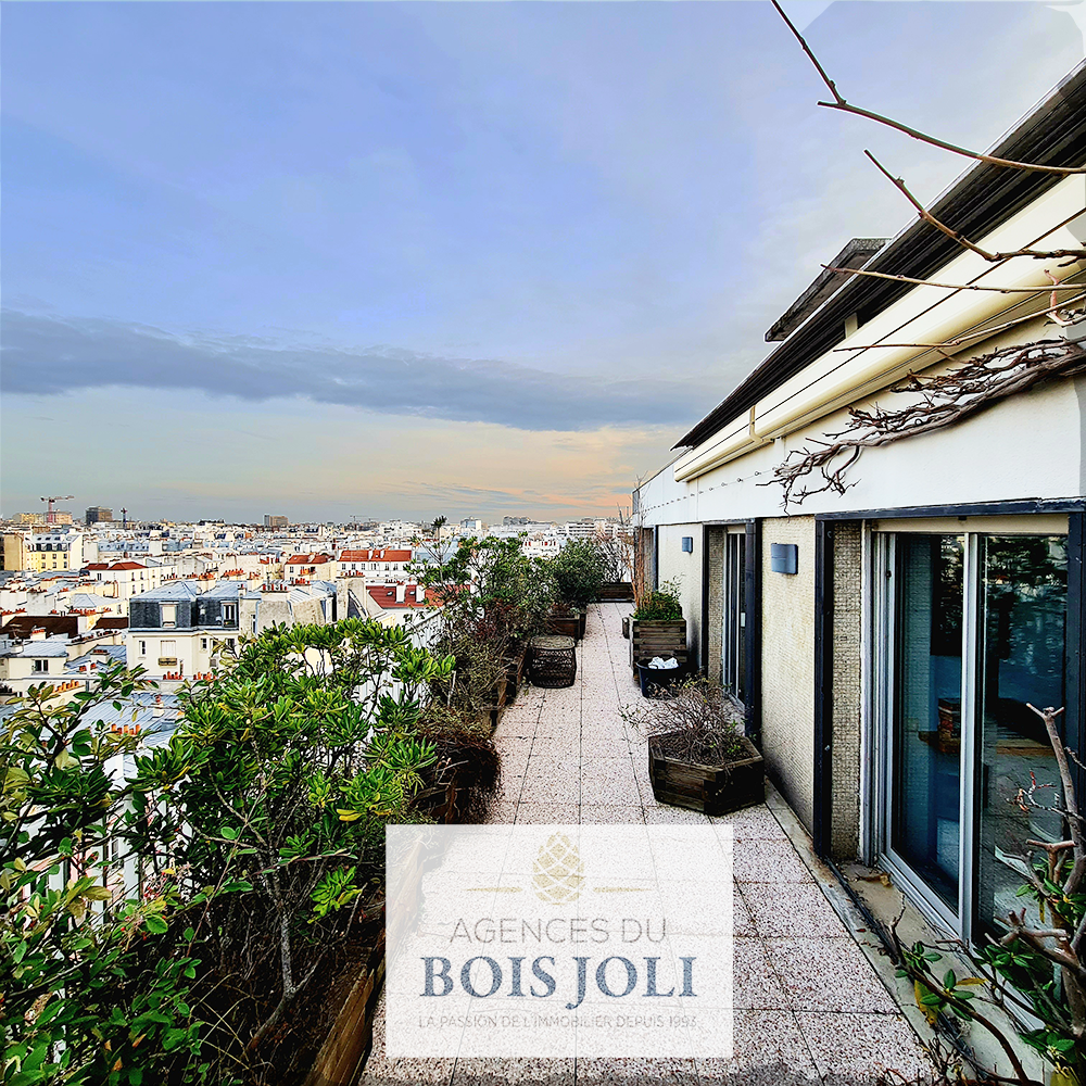 Terrasse avec vue dégagée sans vis à vis sur les toits de Paris et ses monuments.