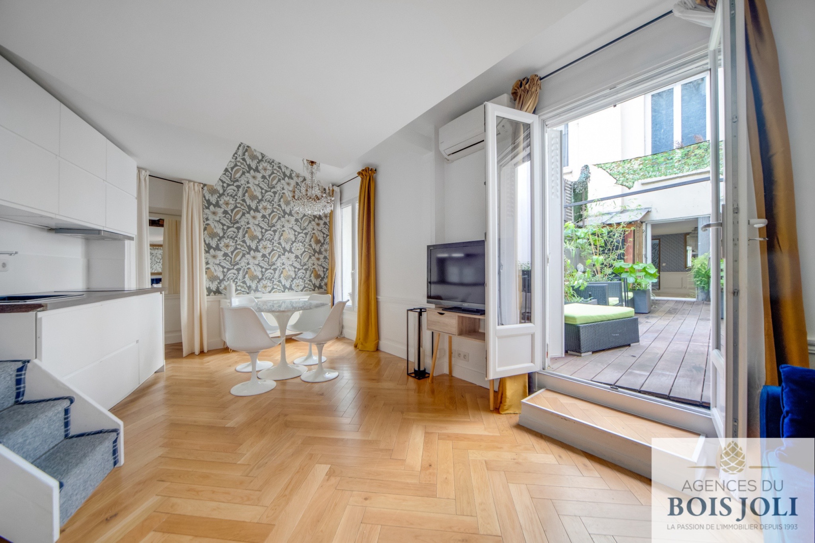 Le bien totalise une surface de 78m2 Carrez, 85m2 au sol et 21m2 de terrasse, il se situe au premier étage d’une copropriété de la rue Lamartine, proche des commerces de la rue des Martyrs, des grands boulevards, des lieux animés, des théâtres, des lignes 7 et 12, de trois grandes gares parisiennes…